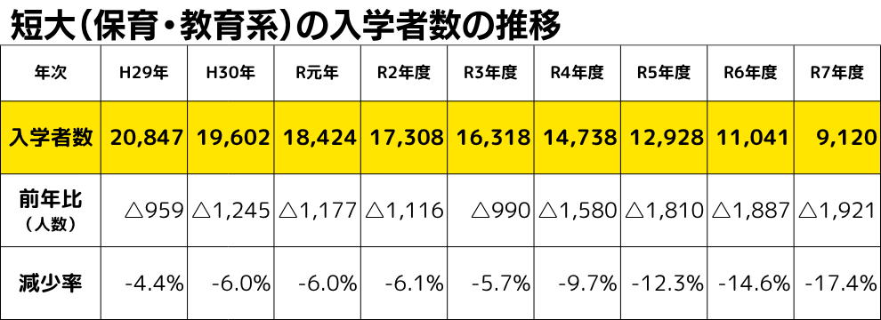 なんと、保育士養成校の短大入学者数は前年より1,900人減少。